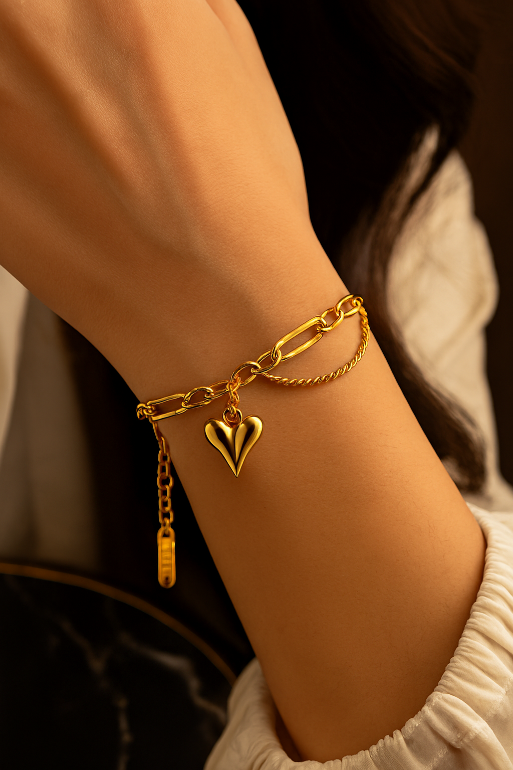 Ce bracelet incarne la rencontre parfaite entre design raffiné et matériaux durables. Son allure dorée attire immédiatement le regard, avec une finition brillante qui évoque le luxe sans compromis. Les maillons alternés, tantôt allongés, tantôt arrondis, créent un rythme visuel élégant, tandis que le charme central en forme de cœur ajoute une touche romantique et féminine. Ce détail délicat fait de ce bijou un symbole d’amour, de style et de personnalité.