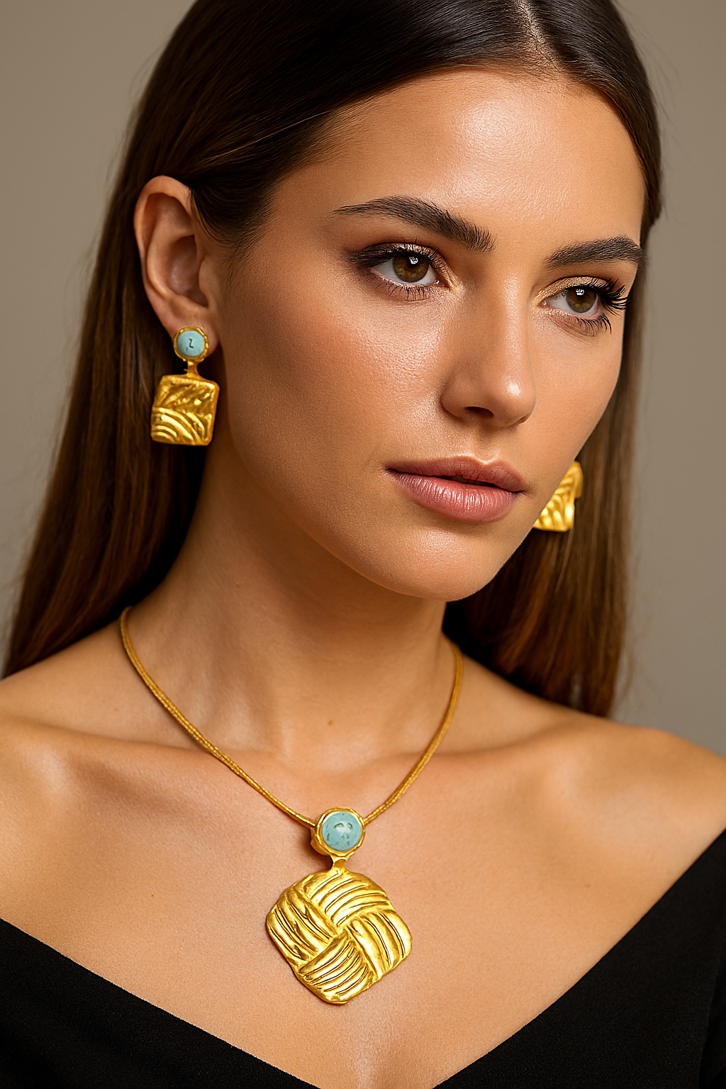 Sublimez votre style avec cette parure raffinée composée d’un collier et de boucles d’oreilles assorties. Chaque pièce est ornée d’un pendentif carré au design ondulé, mettant en valeur une pierre turquoise ronde sertie dans un élégant contour doré.