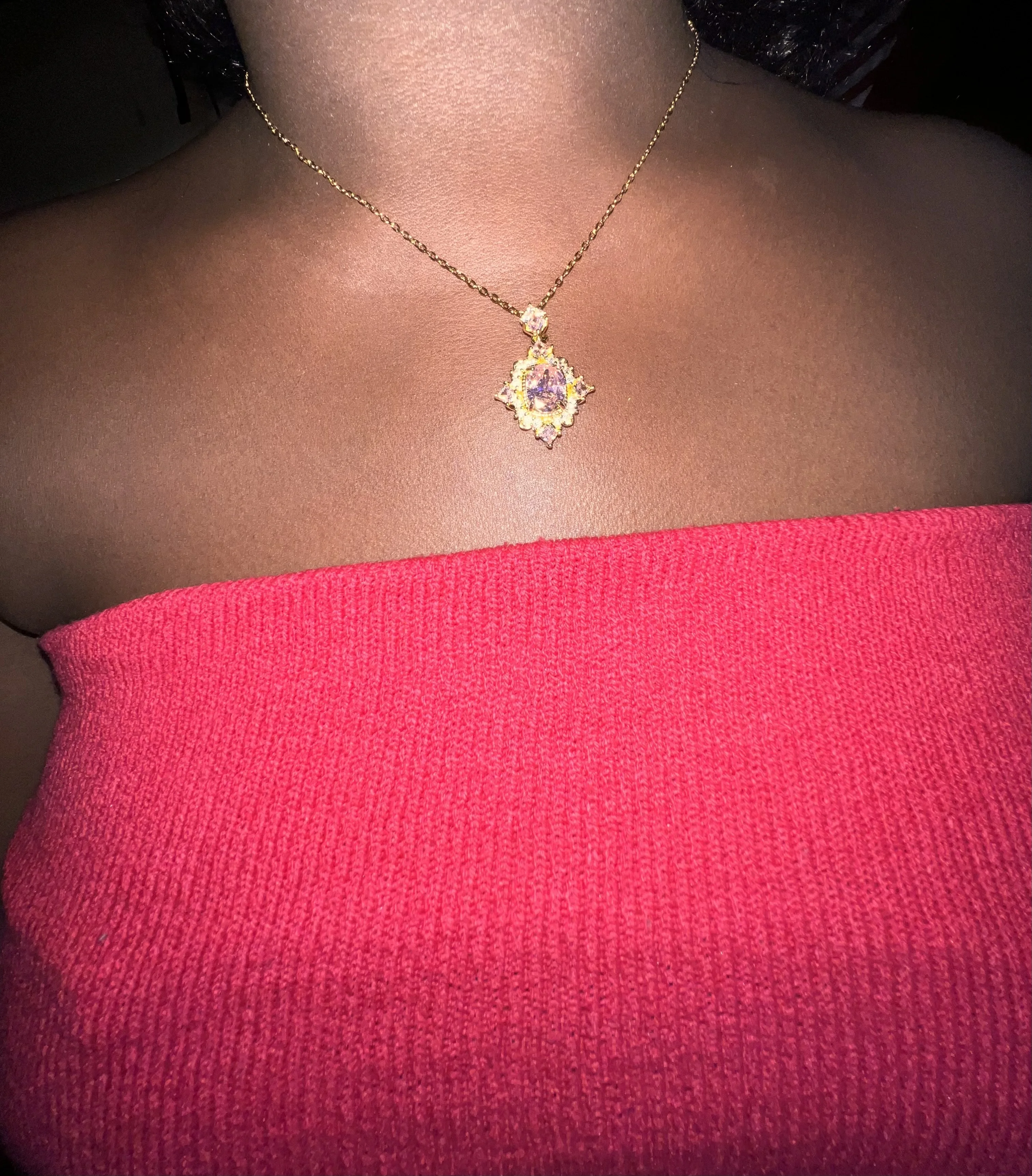 Ce collier somptueux est une véritable pièce maîtresse, conçue pour celles qui aiment briller avec distinction. Son pendentif central, orné d’une pierre rose ovale entourée de cristaux scintillants, évoque le raffinement des bijoux royaux. Chaque détail est pensé pour capturer la lumière et sublimer le port de tête.
